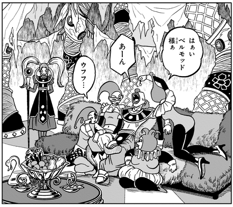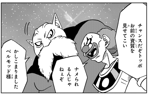 When the almighty Zeno requests that Goku and Toppo fight, Belmod instructs his pupil to go show everyone what he's made of so that they have no choice but to acknowledge his power. When Toppo begins to overpower Goku, Belmod is pleased and praises Toppo's fighting style. He tells Toppo to go guarantee the victory and then watches the proceedings with a confident look on his face.