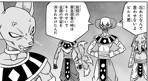 It is there that he challenges Beerus, stating that Universe 7's God of Destruction was the reason that all the universes almost got destroyed at their last godly gathering, which turns the other gods against Beerus too.