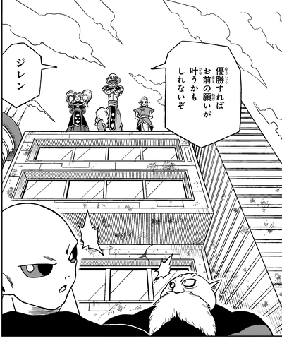 Belmod personally goes to Jiren to ask him to enter the Tournament of Power. To convince the mighty warrior to take part in the competition, Belmod promises to resurrect Jiren's late master, Gicchin, with the Super Dragon Balls once they win the tournament.