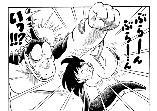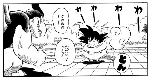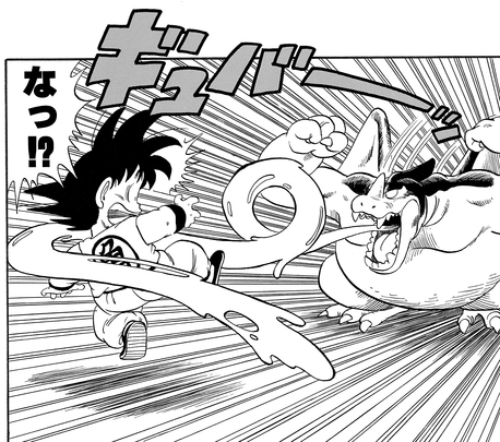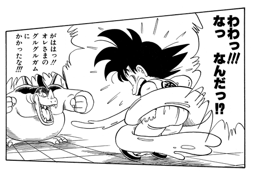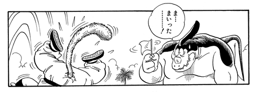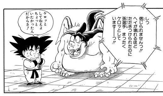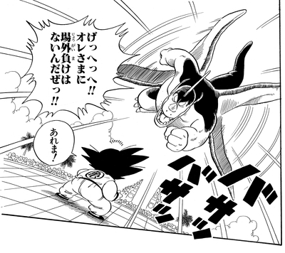 Giran is having none of this tomfoolery and protests to the referee that using a tool like that is breaking the rules of the tournament. After some deliberation, the judges decree that Goku will be disqualified if he uses Kintoun again. This suits Giran just fine, and he repeats his plan to throw Goku out of bounds. The Saiyan lad barely manages to hang on—quite literally—by clinging to the monster's arm using his tail, which had miraculously grown back.