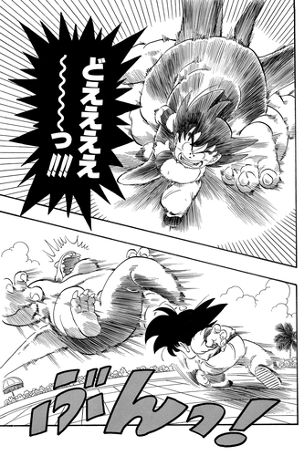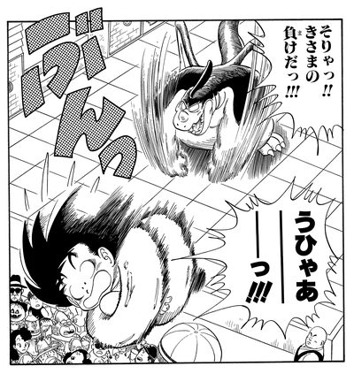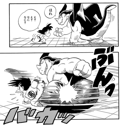 He lands a surprise attack that sends Goku crashing into the wall of the tournament ring but is shocked when the young Saiyan warrior emerges practically unscathed.