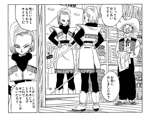 Android 18 stopped by a clothing store while tracking down Goku but described the clothes she tried on as "hideous" right to the shopkeeper's face! Unfortunately for the stylish cyborg, she was in the countryside with no other option and had to make do. She did straight-up leave without paying, though, so in the end this tassel-fringed fashion crime was made even with a real one!