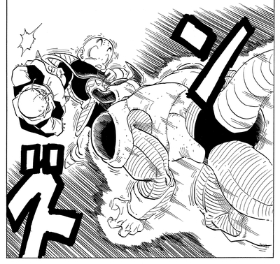 Menacingly remarking, "Let me see, who shall I obliterate first?", he sets his sights on Krillin and impales him upon one of his horns.