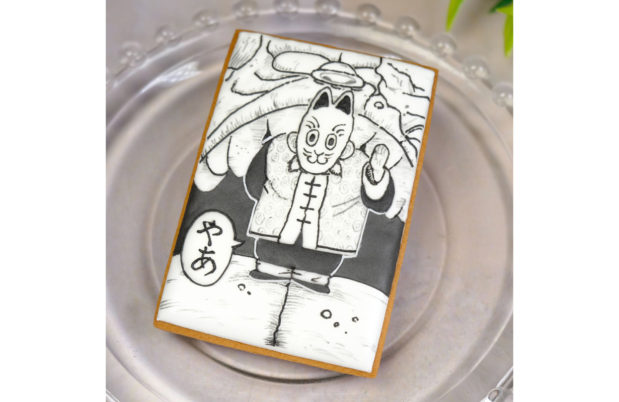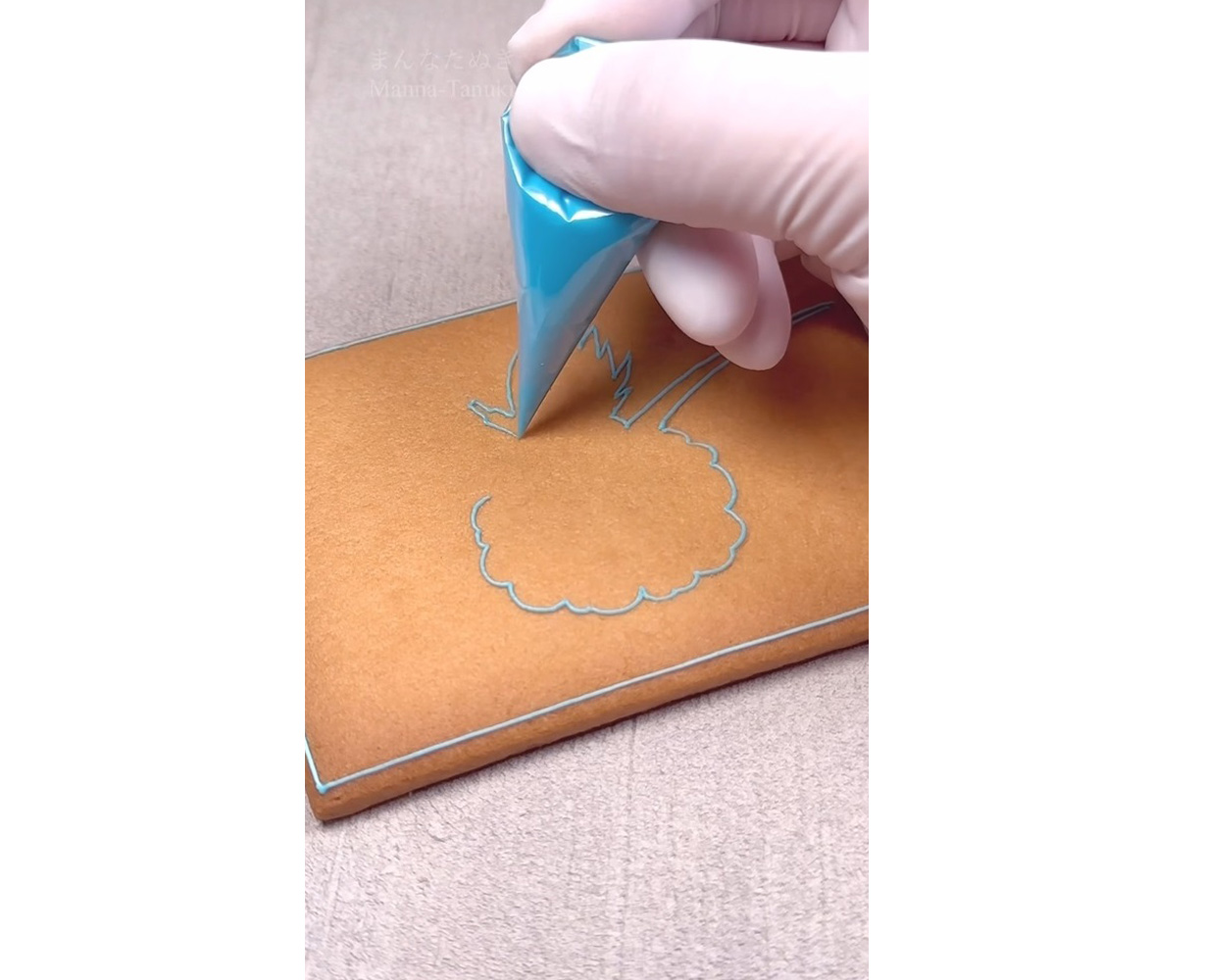 Manna-Tanuki started out by drawing straight lines around the outside of the cookie base like the frames of a manga panel, following which she started to outline a character inside. I wonder what that fluffy-looking mass in the middle could be...