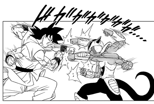 He exchanges a flurry of high-speed blows with Goku, all the while carefully calculating his Saiyan foe's strength so that he can find the most opportune moment to transform.