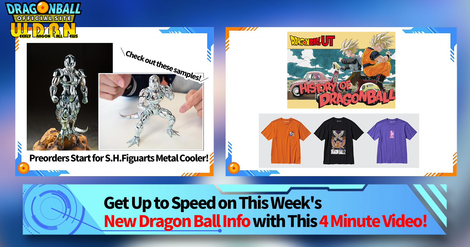 "Weekly Dragon Ball News" is a video series updated every Monday (JST) to bring you the latest news in the world of Dragon Ball! Join V Jump editor Victory Uchida as he covers all the hottest info released in the previous week as well as fresh updates like new product info and site news for the week to come!