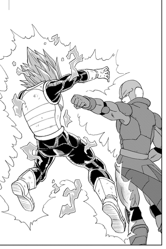 During the tournament, Universe 6's warriors are knocked out one by one until only Hit is left to face down Universe 7's remaining members, starting with Vegeta.