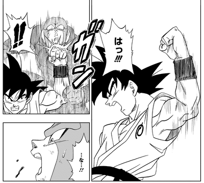 Goku then fires a Kamehameha that Hit manages to barely avoid, causing the assassin to acknowledge his strength. However, Goku suddenly exits the ring voluntarily and disqualifies himself, saying, "I just can't afford to lose this chance to see our best guy fight," referring to Universe 7's final member, Monaka.