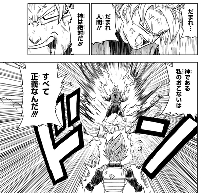 Vegeta once again takes on Goku Black, this time starting off in a weaker Super Saiyan God state. Goku Black mocks Vegeta at first, but finds himself being driven back as Vegeta strategically transforms into Super Saiyan God Super Saiyan only in bursts just as he attacks.