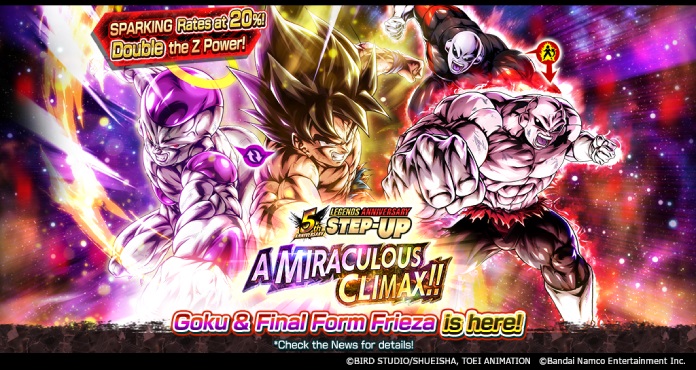 "LEGENDS ANNIVERSARY STEP-UP - A MIRACULOUS CLIMAX!! -" is an incredible step-up summon where you get double Z Power on all drops and the SPARKING character drop rate is boosted to 20% on all steps!