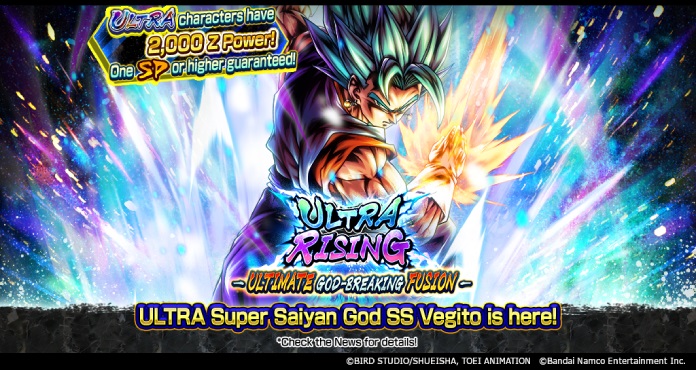 A new summon, "ULTRA RISING - ULTIMATE GOD-BREAKING FUSION -" is on now in the hit app-game Dragon Ball Legends! This is a step-up summon where all steps are 10x Consecutive Summons that are guaranteed to contain one SPARKING or higher rarity drop! Certain steps also contain additional perks: ULTRA character drop rates are doubled on step 2, and step 4 is free! And all throughout the summon, if you pull the new ULTRA Super Saiyan God SS Vegito (DBL61-01U), he'll drop with 2,000 Z Power!!