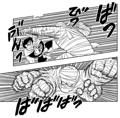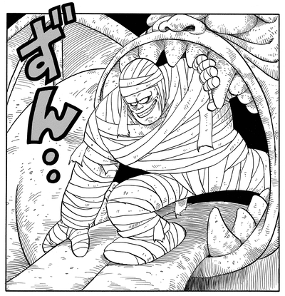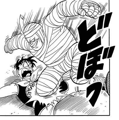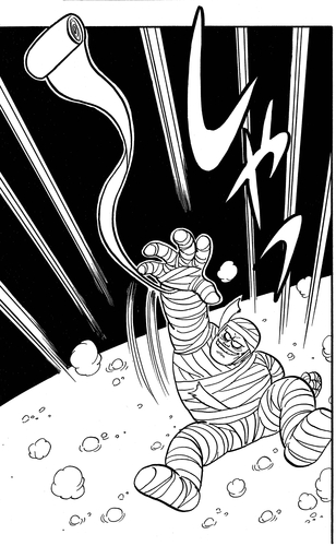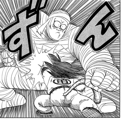 He fires off a full power strike at the boy, but it has no effect whatsoever! Goku then responds with a punch of his own that quickly puts the mummy down for the count.