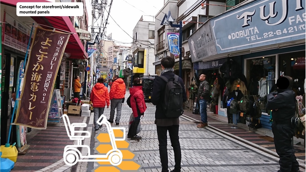 An image of what charging panels installed at storefronts and on sidewalks in Japan could look like. (Provided by the University of Tokyo)
