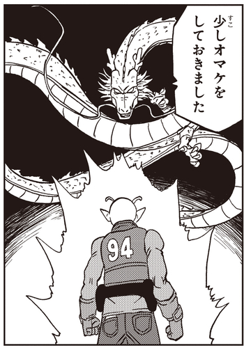 Although the Dragon Balls aren’t where he thought they’d be, Dende manages to upgrade Shenron so that Piccolo can use the Dragon Balls to have the mighty dragon unlock his true power! He then heads off to Capsule Corporation where Bulma had already gathered all seven Dragon Balls and makes his wish. In addition to the powerup, Shenron mentions something about throwing in a little "extra", but just what could that be...?