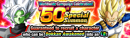 "World Campaign Celebration! "50" Special Summon" is on! You can play 2 versions of this summon: one that uses fifty "50" Special Summon Tickets and one that is playable with 200 Dragon Stones! Each version can be played only once and guarantees 3 featured characters and 1 SSR character who can be Dokkan Awakened into an LR!
