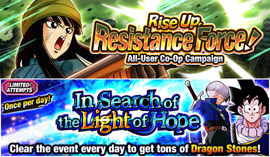 You also won't want to miss Part 1 of the "Rise Up, Resistance Force! All-User Co-Op Campaign" or "In Search of the Light of Hope", a Limited-Attempts Event that you can play once per day to get Dragon Stones! There's also the "Super Warrior Memorial [Trunks, Fighter of Hope]" Story Event where you can recruit [Facing a Mysterious Time Machine] Trunks (Teen) as well as another Limited-Attempts Event, "End the Tragedy! Future Fighters' Super Training" that you can play once every 7 days to get EX Skill Orbs for your "Future Saga" Category characters! There's even more incredible content coming soon, so log in and go all out playing these truly worldwide scale events!