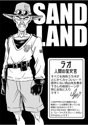 Rao is a gruff sheriff who appears in SAND LAND, Akira Toriyama's legendary manga, and now that same manga has been turned into a hit film that's playing in Japan as you read this! The new scenes that Toyotarou mentions in his comments happen during the climax of the film, and Rao plays a major role! Be sure to experience Rao's coolness firsthand at a movie theater near you!
