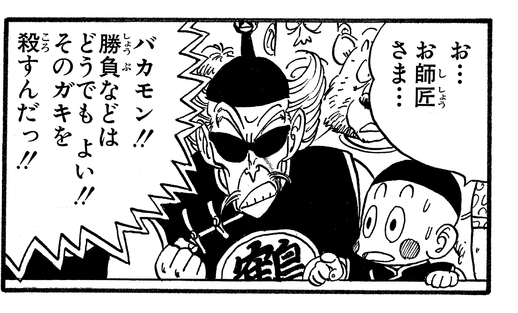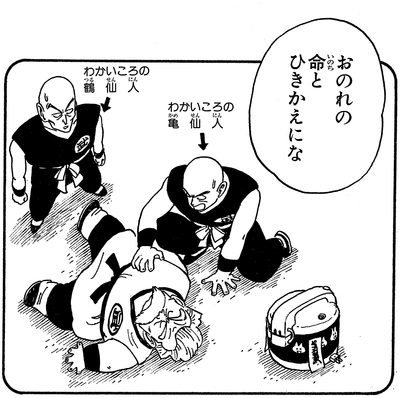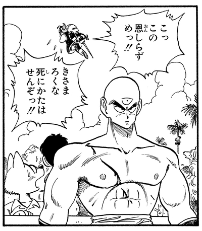 However, Tenshinhan wanted to win the fight fair-and-square, which leads an enraged Tsurusennin to tell his student, "You've forgotten what you owe me…for making you into the champion you are…!!"