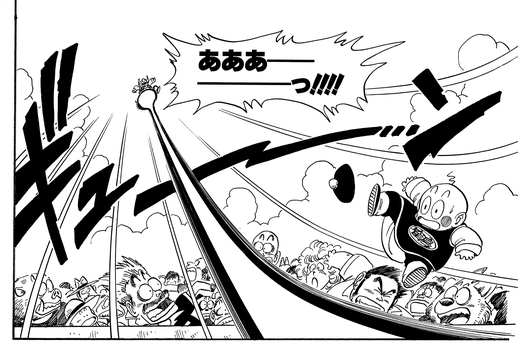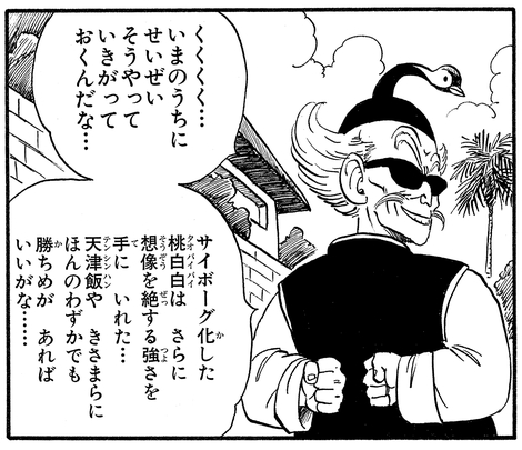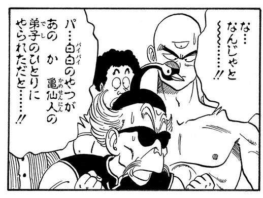 Despite Tsurusennin's boastful advice to "run before you Turtle School bumblers are all cooked in your shells," Taopaipai suffers a crushing defeat at the hands of Tenshinhan, who had grown to be surprisingly strong.