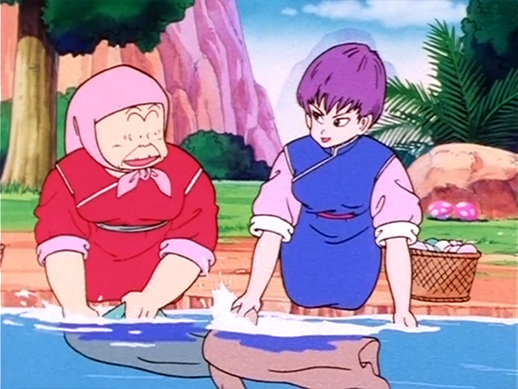 With Kamesennin's help, Goku goes to meet Mutaito and begins training under him. For the first part of his training, he is told to practice separating the water cascading down from a waterfall. During this training, Goku discovers a scarf belonging to Fan-Fan (she was doing laundry upstream) and returns it to her.