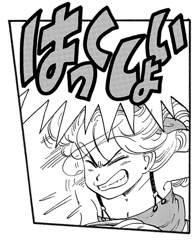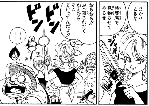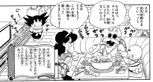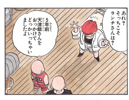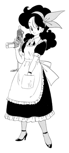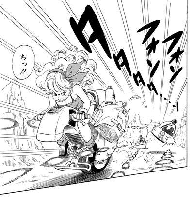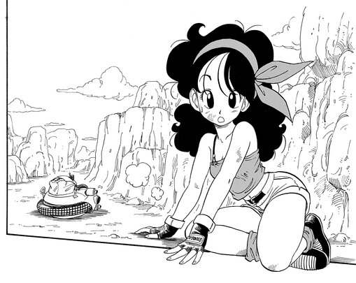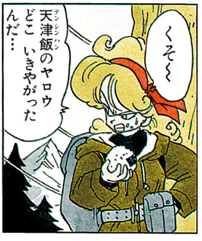 And while it doesn't appear in the main story, she can also be seen furiously searching for Tenshinhan in a special piece done for Weekly Shonen Jump's " Put the Old Year Behind You! Jump Characters Face Off at Short GAG Land".