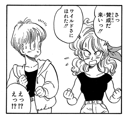 She becomes overwhelmed with emotion during Goku and Tenshinhan's bout, causing her to exclaim "I’ve fallen in love with your savagery!!" to the now reformed Crane School Dojo fighter.