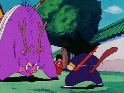 Goku saves Inoshikacho from the Tsuru School duo, and as a sign of gratitude, the animal volunteers to train with the lad as his sparring partner.