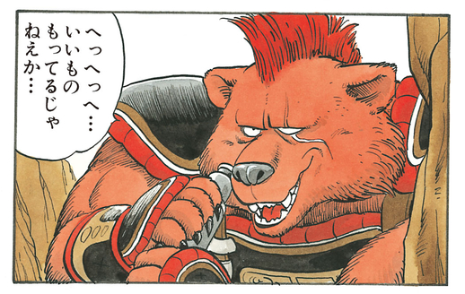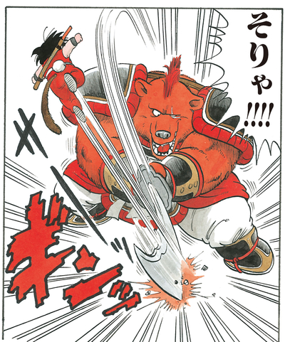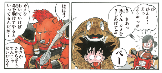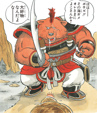 While our heroes are on their way to return Umigame to the ocean, Bandit Bear pounces and attempts to steal the turtle. Goku refuses, which causes the bandit to growl "So...You wanna be my appetizer, eh...?" and put the lad in his crosshairs instead...