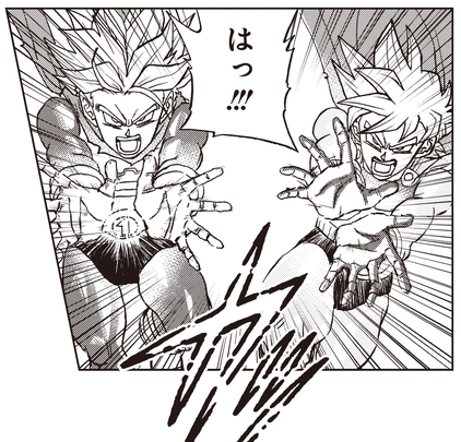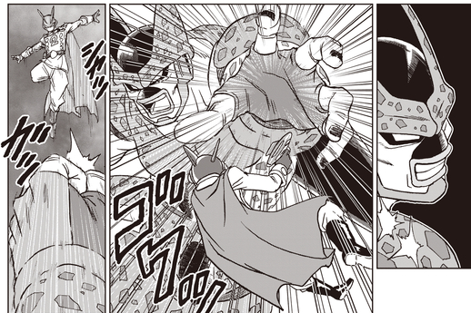 Just as the two young heroes planned to land a big blow on Cell Max, the Gammas join the fight! Each demonstrate their own signature pose and land a perfectly coordinated attack on Cell Max.