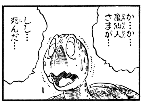 Further on in the story, Umigame was deeply shocked when Great Demon King Piccolo murdered Kamesennin, and cried tears of joy when his friend was resurrected using the Dragon Balls.