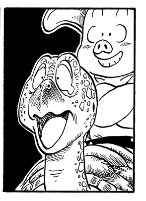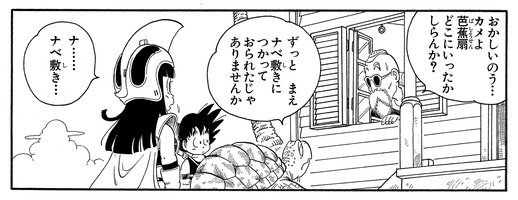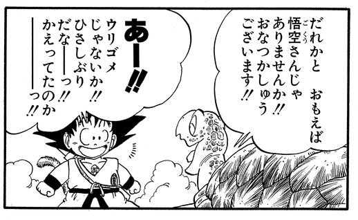 Goku returns again later in the story to borrow a submarine for his search for the Dragon Balls. Goku shows that remembering names is not his strong suit and mistakenly calls the kindly turtle "Urigome".