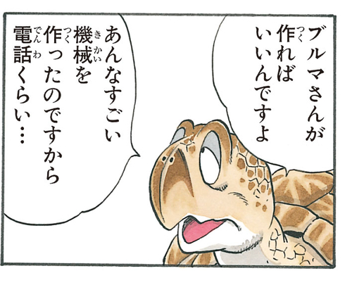 When Goku goes to tackle the Red Ribbon Army Headquarters head-on, Bulma is frantic to get in contact with Yamcha by telephone. The young inventor goes into a panic because there's no phone at Kame House, but Umigame calms Bulma and reminds her of her technical prowess by saying "But ma'am, if you could build that... then surely something as simple as a telephone shouldn't be...?"