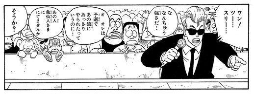 Umigame even comes close to discovering the true identity of Jackie Chun at the Tenkaichi Budokai, going as far as to say "That fellow does remind one of our Kamesennin, wouldn't you say?"