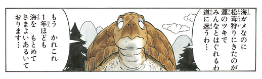 Umigame ventured into the mountains in search for some delicious mushrooms, but got separated from his companion and ended up wandering in search of the ocean for about a year.