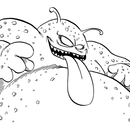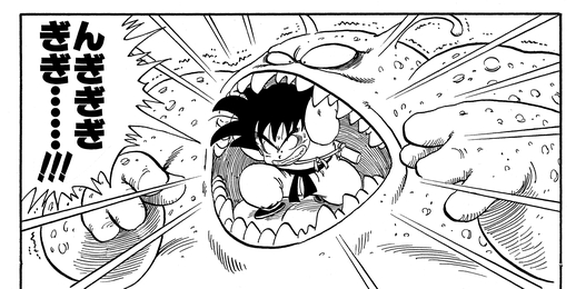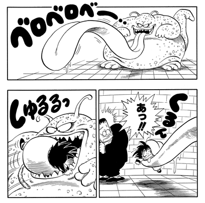 Buyon fires an electric attack from his horns that paralyzes Goku. The monster then wraps the youngster in his long tongue and attempts to eat him, but Goku uses his super strength to force the monster's mouth open at the last moment.