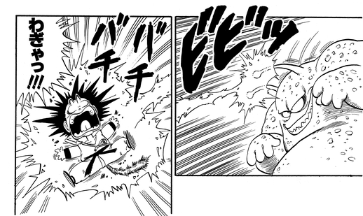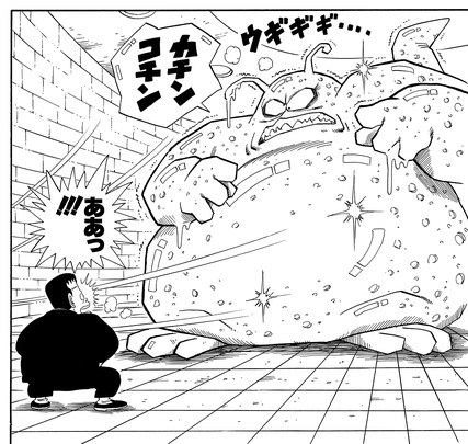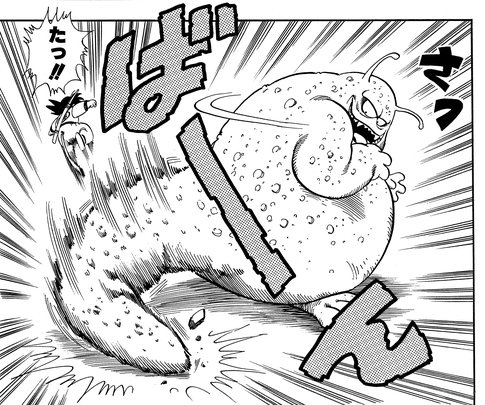Goku attacks Buyon's head and stomach, but Buyon's wiggly body absorbs the attacks and uses the momentum to send Goku ricocheting around the room!
