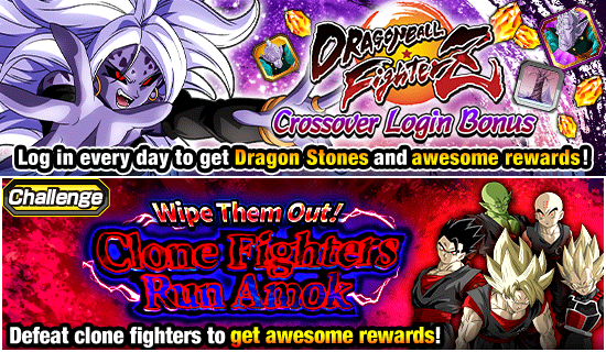 The Dragon Ball FighterZ Crossover Login Bonus is on, and in it you'll be able to recruit [Assisting with the Rampaging Clones Incident] Android #18 (Linked State) the first time you log in during the campaign period! Then, clear Crossover Special Missions to get Awakening Medals you can use to Dokkan Awaken [Assisting with the Rampaging Clones Incident] Android #18 (Linked State)! In addition, there are lots of other fun events going on, such as the "Wipe Them Out! Clone Fighters Run Amok" Challenge Event where you'll fight to defeat as many clone fighters as you can within a limited number of turns to get awesome rewards! Dive into the world of Dokkan Battle and have a blast in the Dragon Ball FighterZ Crossover Special Campaign!
