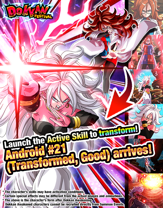 And that's not all! Once Dokkan Awakened, Android #21 (Normal) gains an Active Skill that enables her to transform into Android #21 (Transformed, Good) once certain conditions have been met! After transforming, this potent Android fighter gains a new Active Skill that makes her attacks effective against all types!
