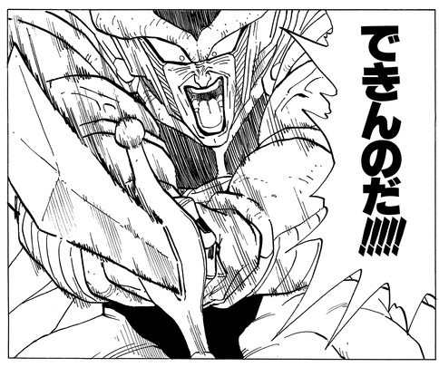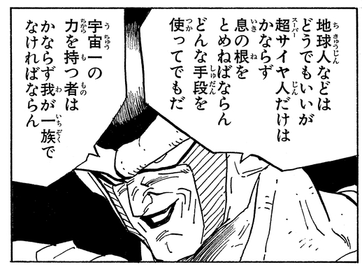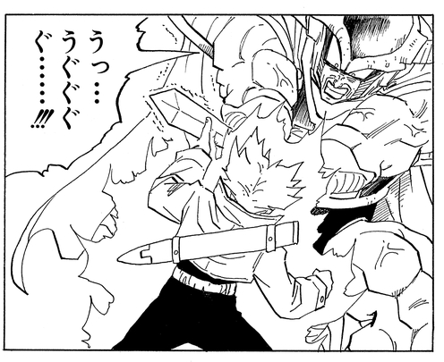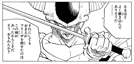 Once he has the sword in hand, he calmly examines the blade and comments, "Yes... It has a fine edge on it... It was this that enabled you to defeat Frieza, don’t you think?" before suddenly attacking the half-Saiyan!