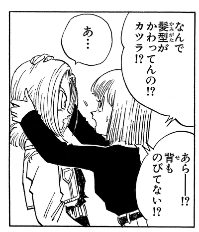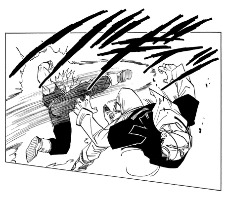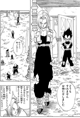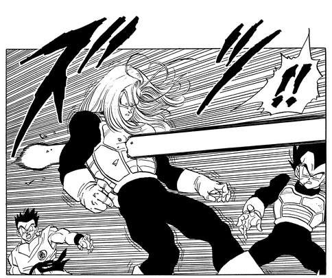 Android 20, who was in a bit of a pickle when Vegeta took out Android 19, activates Androids 17 and 18. Trunks rushes in to help Vegeta, who's been cornered by Android 18, but then the tables are turned by Android 17.