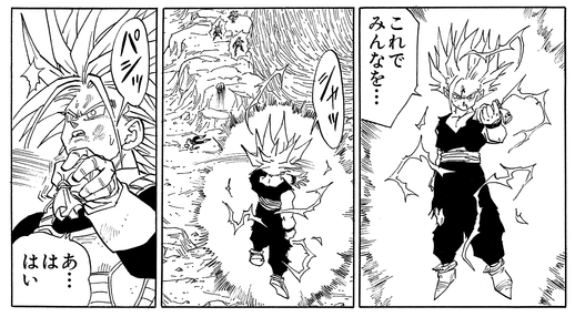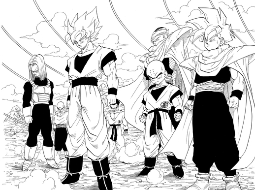 With the strength he gained through training in the past, he is not only able to defeat Androids 17 and 18, but also the Cell from his timeline, and thus achieves true peace at last.