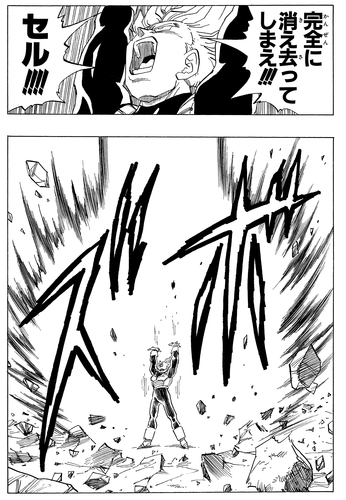 Cornered by Gohan, Cell self-destructs. However, he is revived from his remaining nucleus and kills Trunks with a sudden, powerful attack.