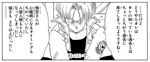 Three years pass, and Androids 19 and 20 attack South City. Once again Trunks returns from the future, but the Androids that attacked South City are not the Androids that Trunks knows. One small change in history can cause many possible futures, so it seems that the past that Trunks arrived in was not the past he knew.