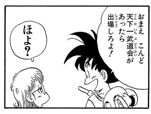 Surprised by her strength, Goku tells Arale that she should participate in the next Tenkaichi Budokai. Arale seems to be perplexed by the whole conversation and only utters a "Hoyo?" in response.