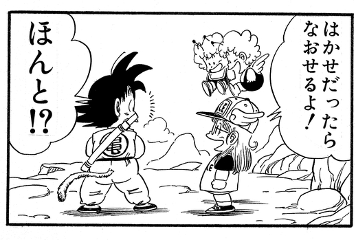Goku speeds away on Kinto'un to chase after General Blue, but is stunned when Arale is able to quickly catch up by simply running at high-speed!