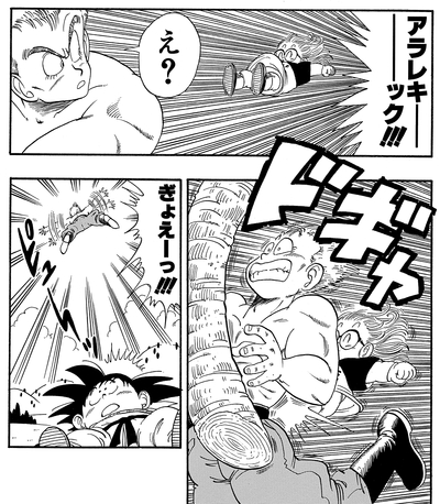 Despite being a gag manga, we witness Arale splitting the earth in half and firing projectiles from her mouth in "Dr. Slump". You can definitely say she's comparable to Goku and the incredible strength he displays in Dragon Ball.