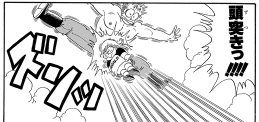 However, Arale quickly turns the tables on General Blue with a stunning dropkick followed by a mighty headbutt that sends the villain careening through the sky!
