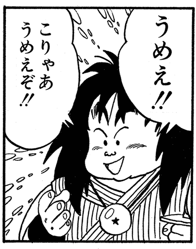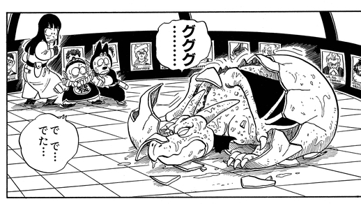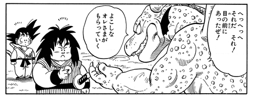 Yajirobe roasts the defeated Cymbal over a fire, declaring, "Yum!! This thing's good!!" But Goku, who usually has quite the appetite, is uncharacteristically uninterested and vehemently turns down the exotic dish with a firm "I don't want any."