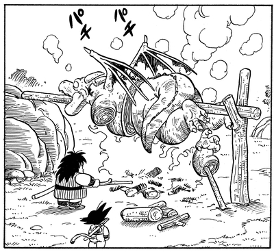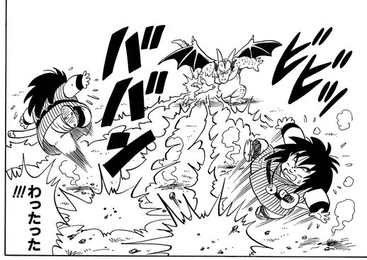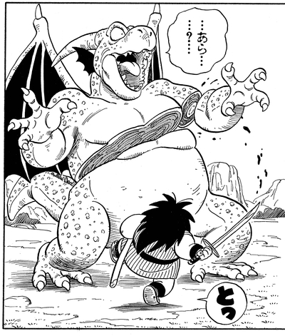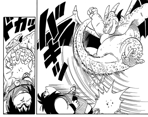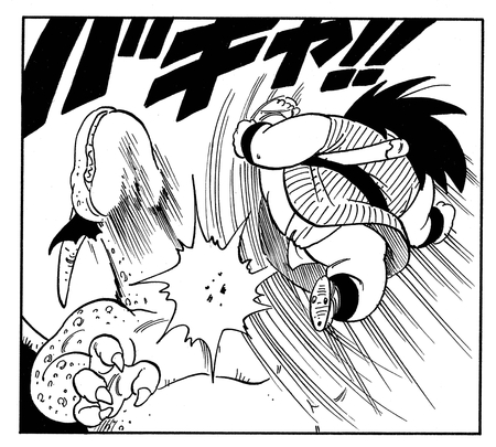 Cymbal's tail swipes and punch have no effect on Yajirobe, and the wild warrior gets in a good kick on the dragon.