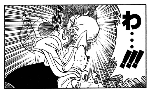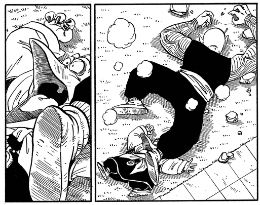 Piano watches the fierce battle from close nearby, but gets crushed beneath his master's body when Piccolo gets sent flying by a devastating punch from Goku.